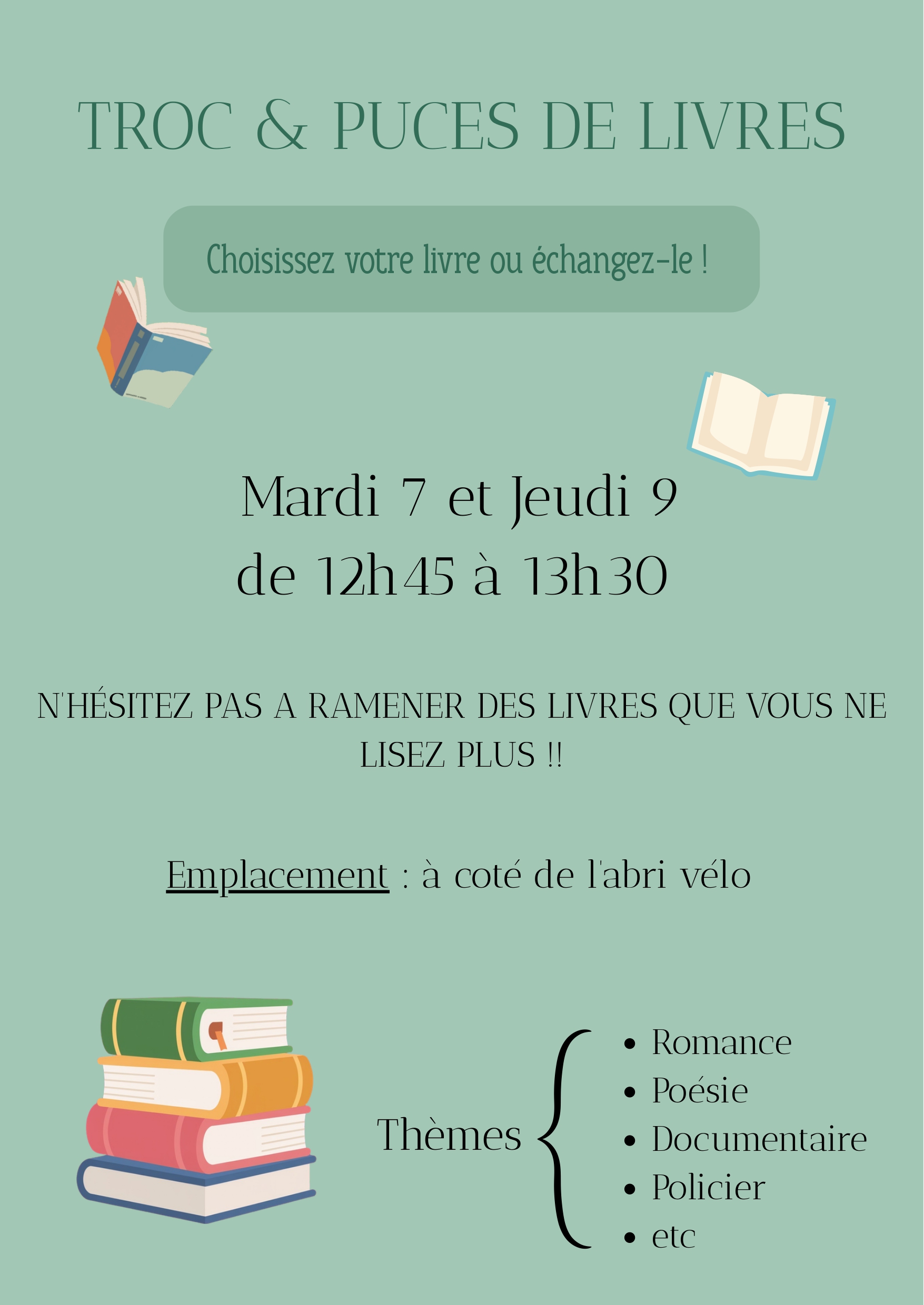 Venez au Troc et puces littéraire les 7 et 9 avril à la pause méridienne entre 12H45 et 13H30.